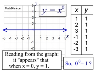 In the first graph's pattern, if we consider any number (not zero) raised to the zero power to be one, then shouldn't zero raised to the zero power fall into that pattern and also be one?