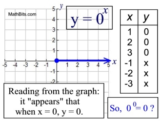 In the second graph's pattern, if we consider any positive number raised to the zero power to be zero, then shouldn't zero raised to the zero power fall into that pattern and also be zero?