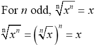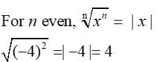 For even roots, the root raised to the same power = absolute value of the inside. This keeps only 1 positive root as the solution (principal root).. |