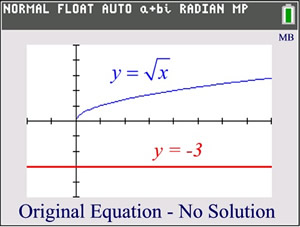 Once the radical was set = -3, it became obvious that there would be NO solution, since the principal square root cannot be a negative value. |