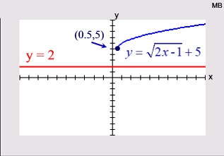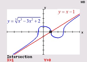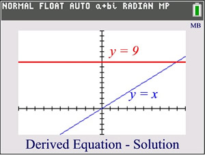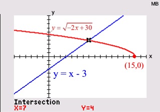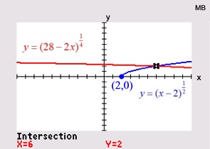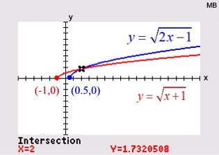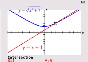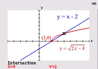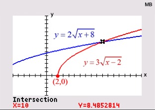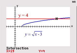 Graph each side of the equation and look for points of intersection. For example, with , the algebraic solution will show TWO possible answers. The calculator, however, will verify only ONE actual solution. The second algebraic solution is an extraneous root. |