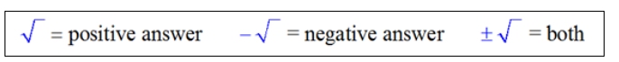 Only a negative sign in front of a square root symbol can indicate a negative solution. Otherwise, the square root symbol alone yields a positive solution only. |