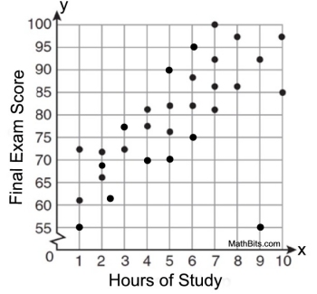 A scatter plot of data is shown at the right. Which statement best describes the association between hours of study and final exam scores?