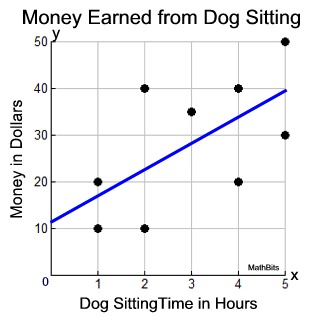 The number of hours spent dog sitting and the amount of money earned is plotted at the right. The line of best fit has the equation y = y = 5.5x + 11.8.
