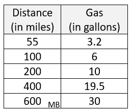 The table shows the number of gallons of gasoline used during five vacation related trips. (x = miles, y = gallons)
