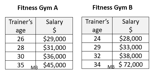 The charts below show data on the number of ceritfied trainers belonging to two fitness gyms. The ages and salaries of the trainers were collected.